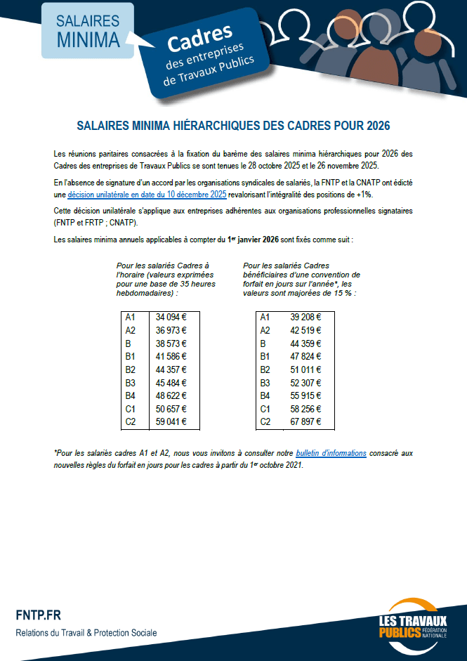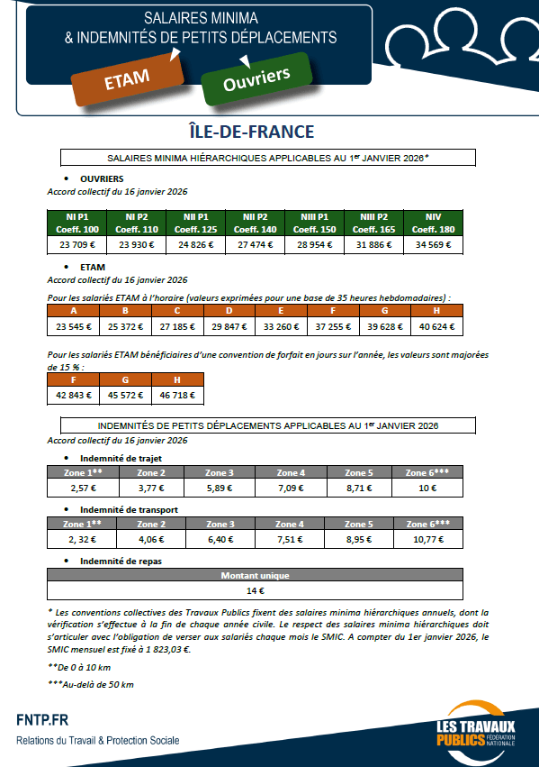 La Commission sociale de la FRTP Ile-de-France a préparé et négocié les accords de salaires minima hiérarchiques Ouvriers et Etam, et les Indemnités de Petits Déplacements que vous retrouverez ci-dessous.